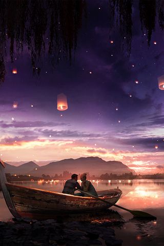 Download 320x480 boat, couple, stars, night, romance, art wallpaper, background samsung galaxy ace gt-s5830, sony xperia e, miro, htc wildfire s, c, lg optimus