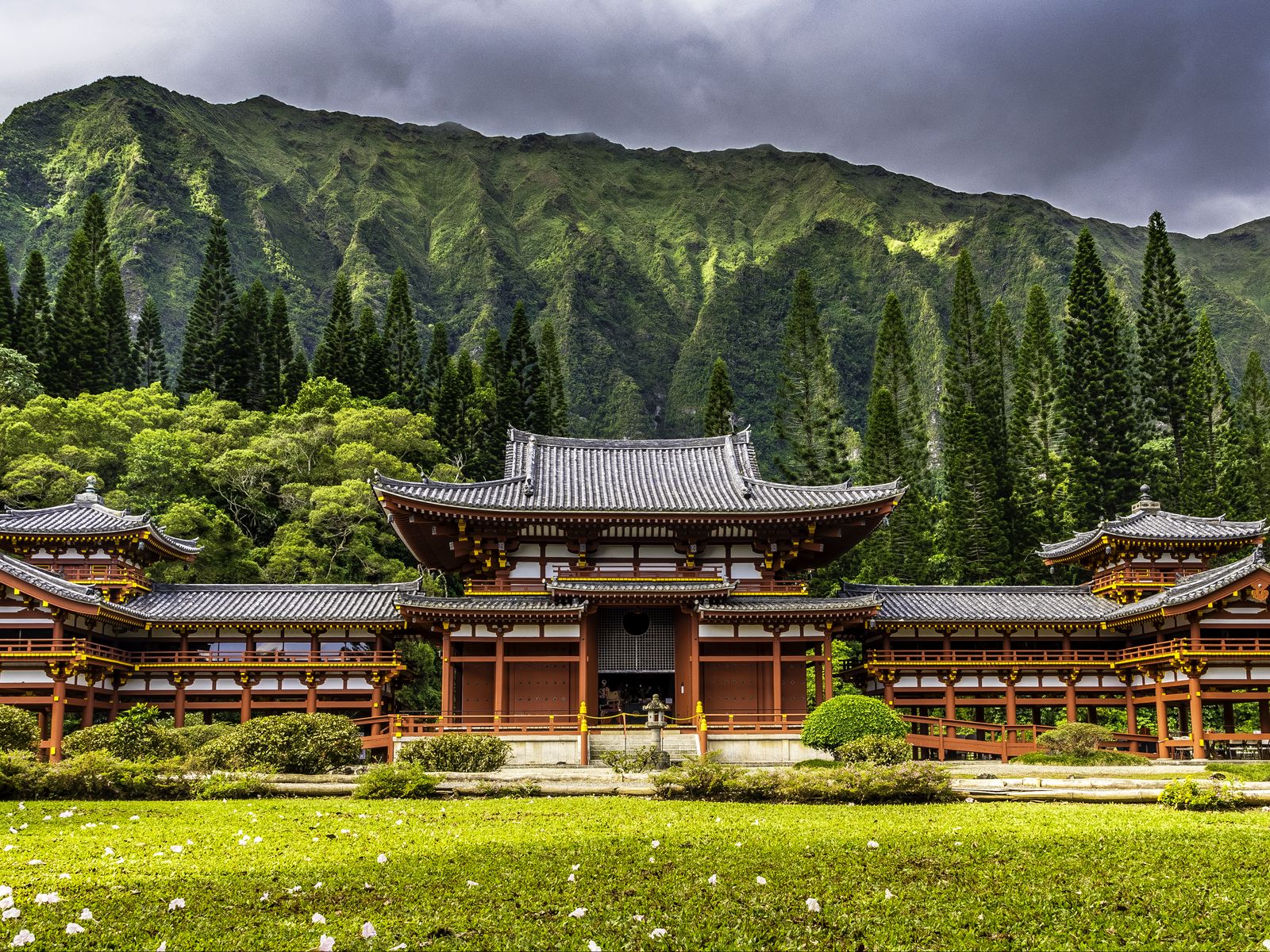Download 1600x1200 building, mountains, landscape wallpaper, background standard 4:3