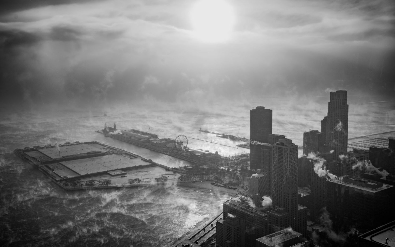 Download 1680x1050 buildings, black and white, clouds, aerial view wallpaper, background widescreen 16:10
