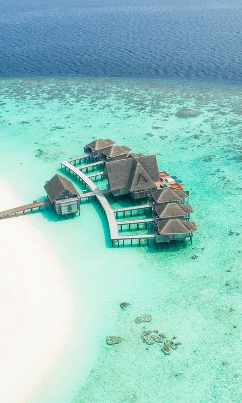 Download 480x800 bungalow, ocean, aerial view, island, maldives wallpaper, background nokia x, x2, xl, 520, 620, 820, samsung galaxy star, ace, asus zenfone 4