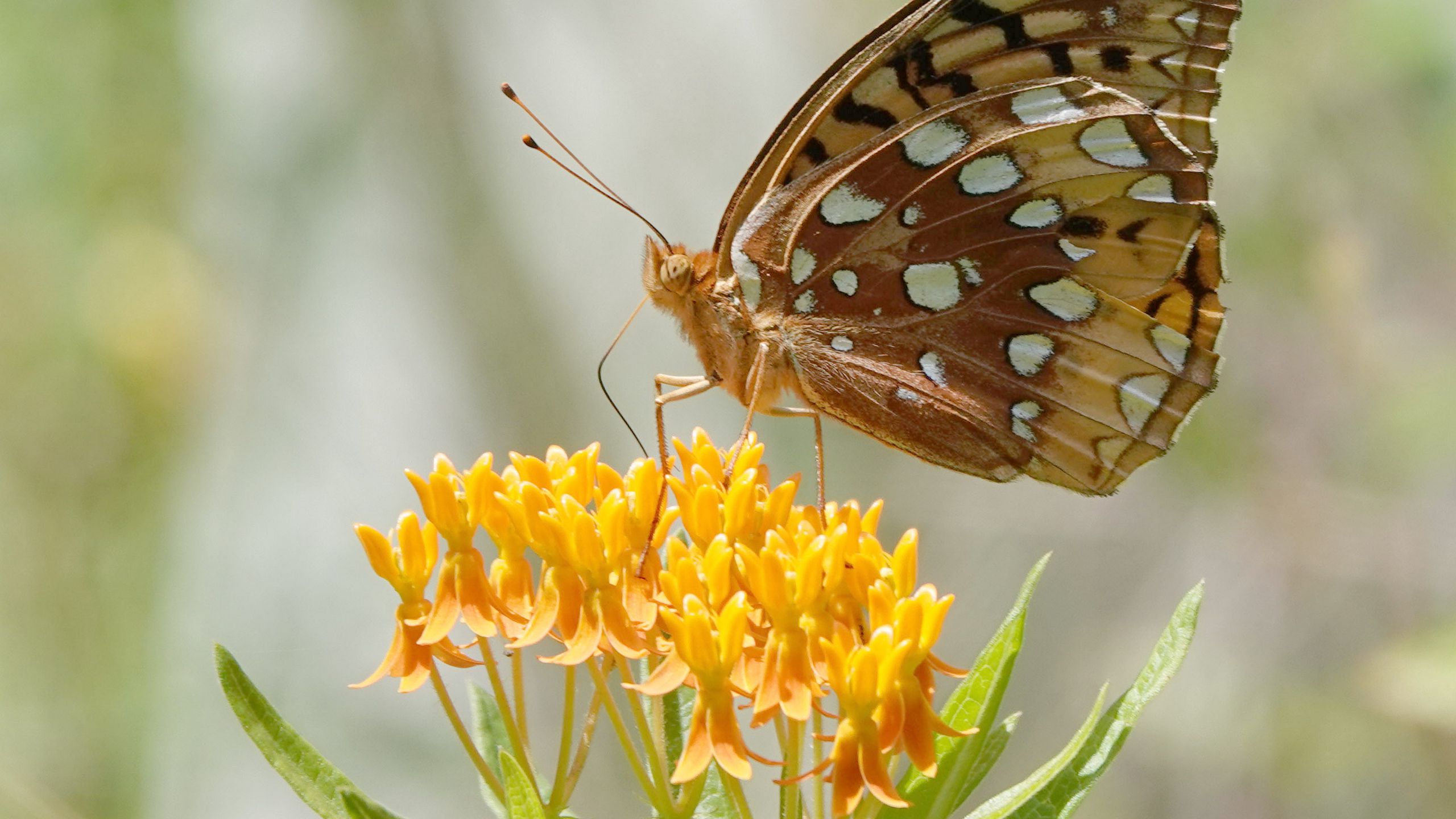 Download 2560x1440 butterfly, flowers, leaves, petals, macro wallpaper, background widescreen 16:9