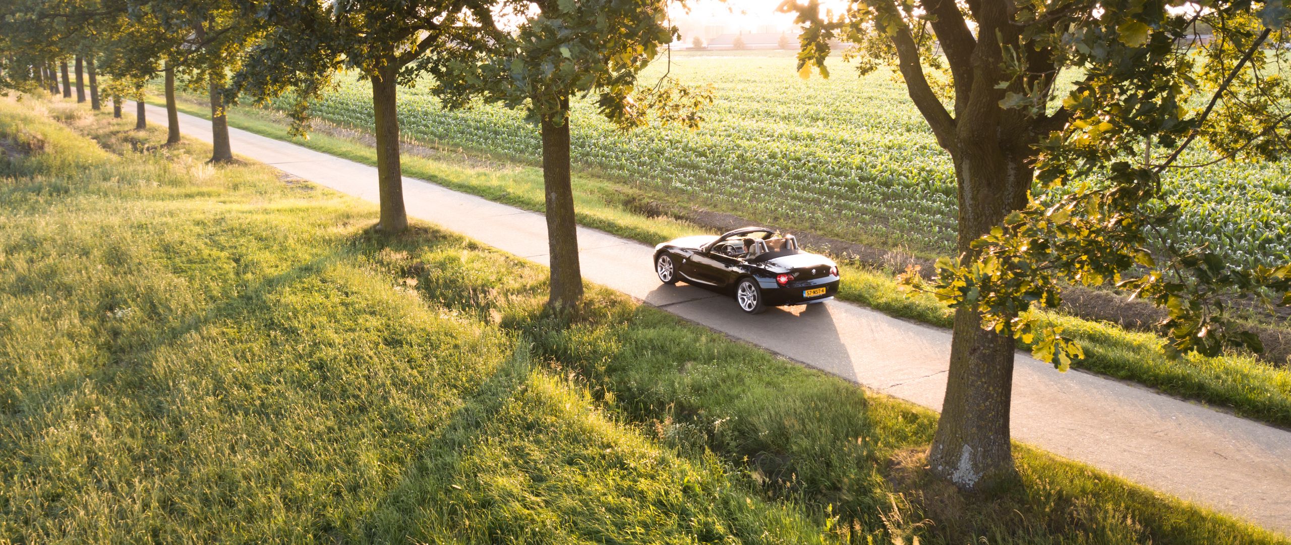 Download 2560x1080 car, convertible, road, sunlight, nature wallpaper, background dual wide 1080p