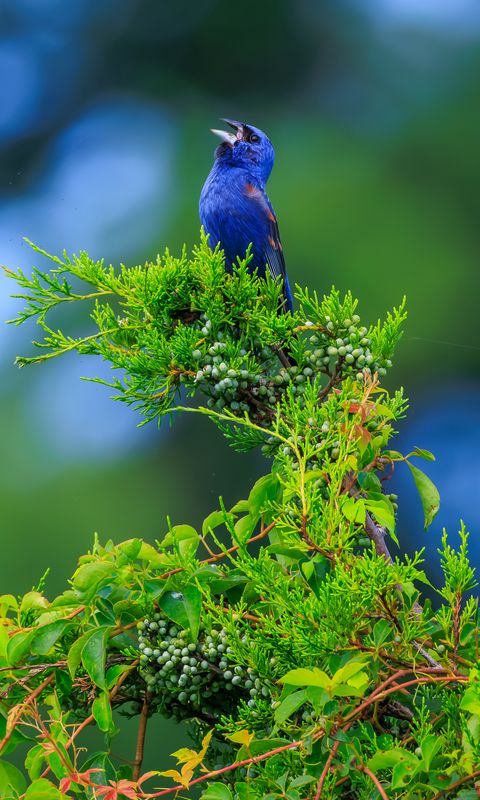 Download 480x800 cardinal, bird, blue, leaves, branches, blur wallpaper, background nokia x, x2, xl, 520, 620, 820, samsung galaxy star, ace, asus zenfone 4
