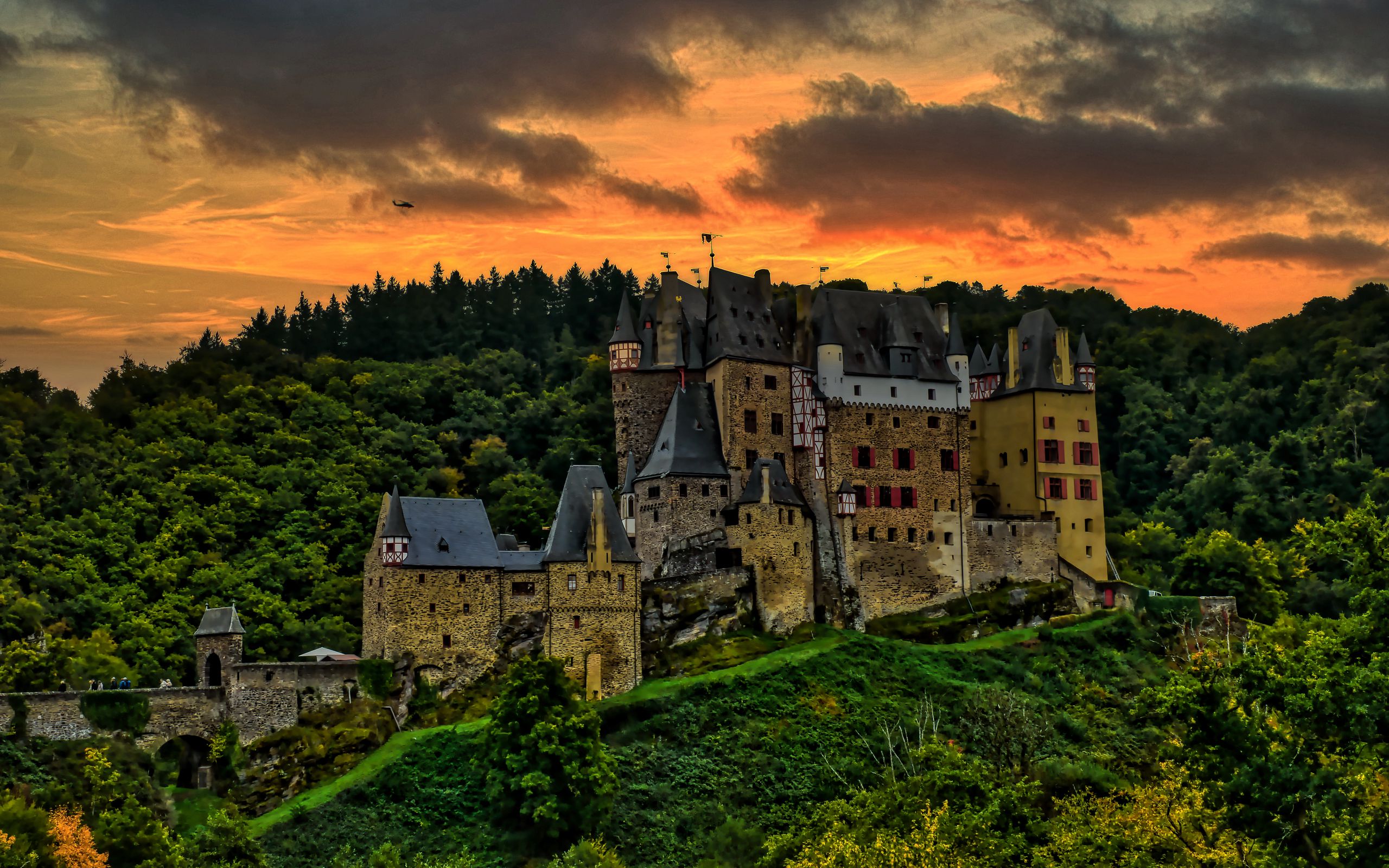 Download 2560x1600 castle, mountain, trees, forest, hill, clouds, sunset, dark wallpaper, background widescreen 16:10