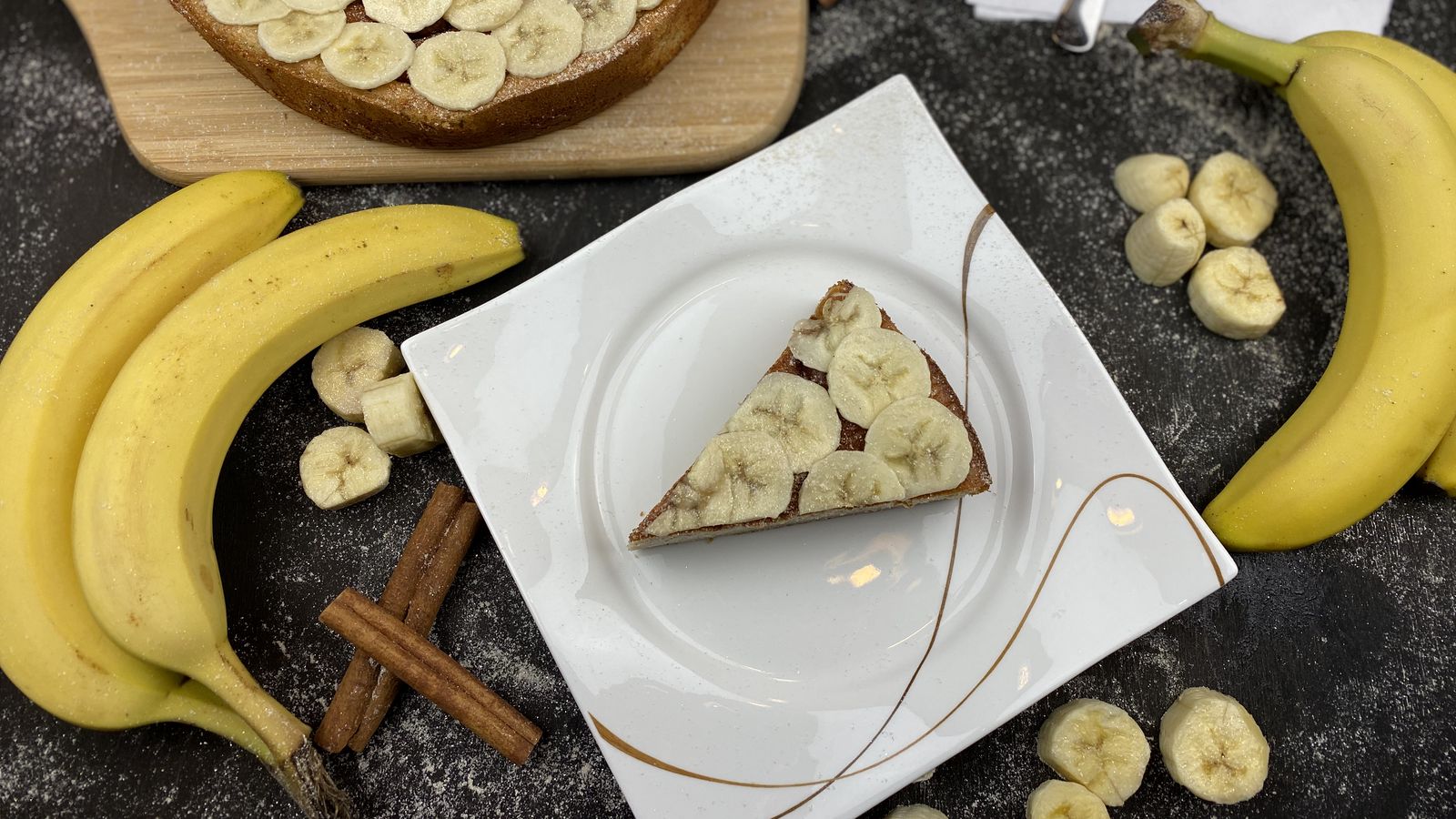Download 1600x900 cheesecake, bananas, cake, dessert, plate wallpaper, background widescreen 16:9