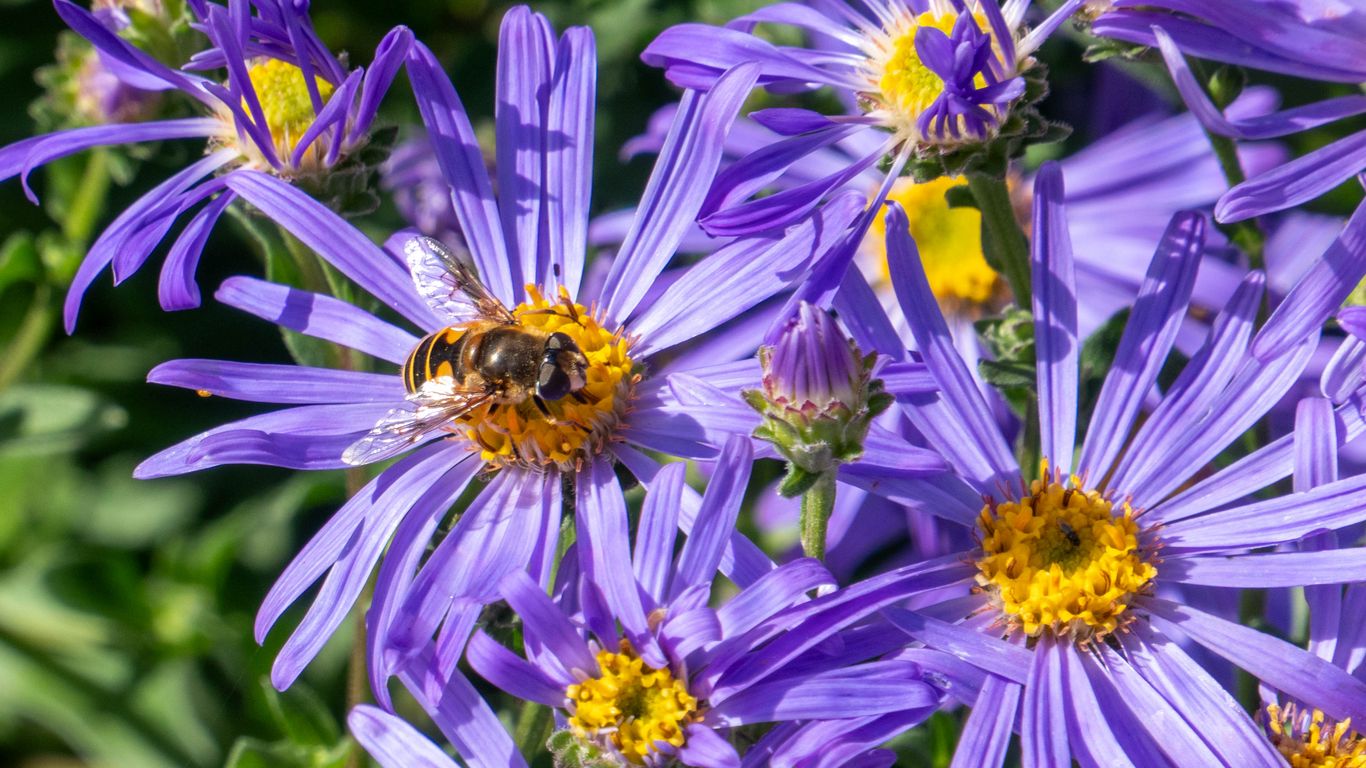 Download 1366x768 cornflowers, flowers, bee, petals, macro, purple wallpaper, background tablet, laptop