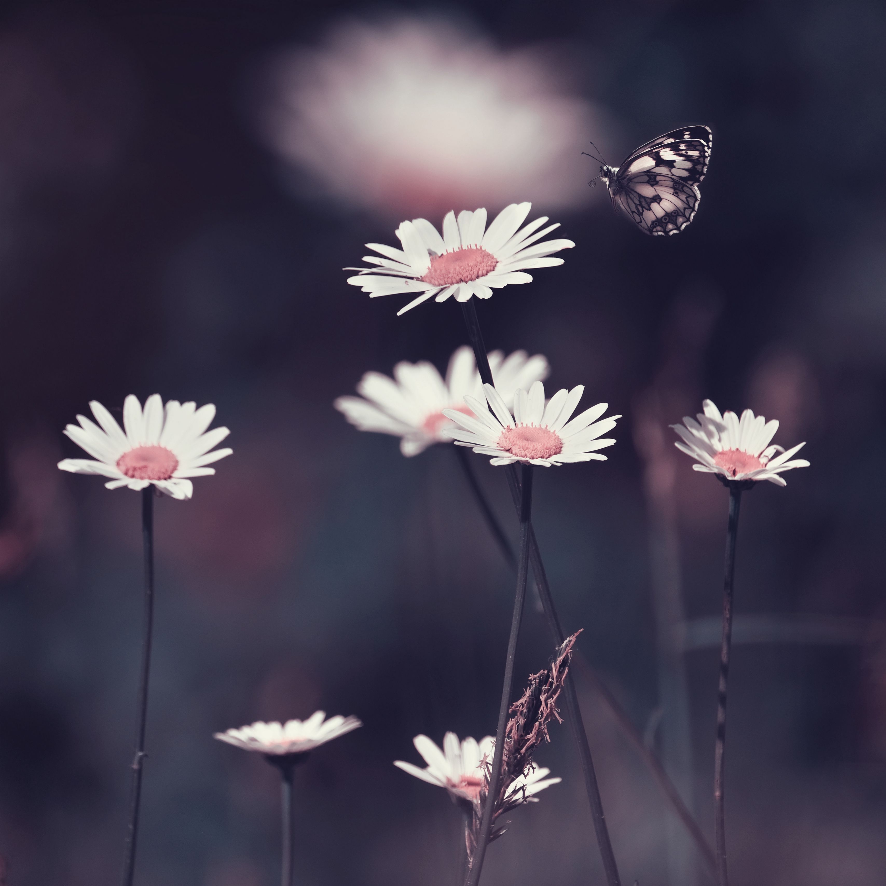 Download 3415x3415 daisies, flowers, butterfly, macro wallpaper, background ipad pro 12.9" retina for parallax