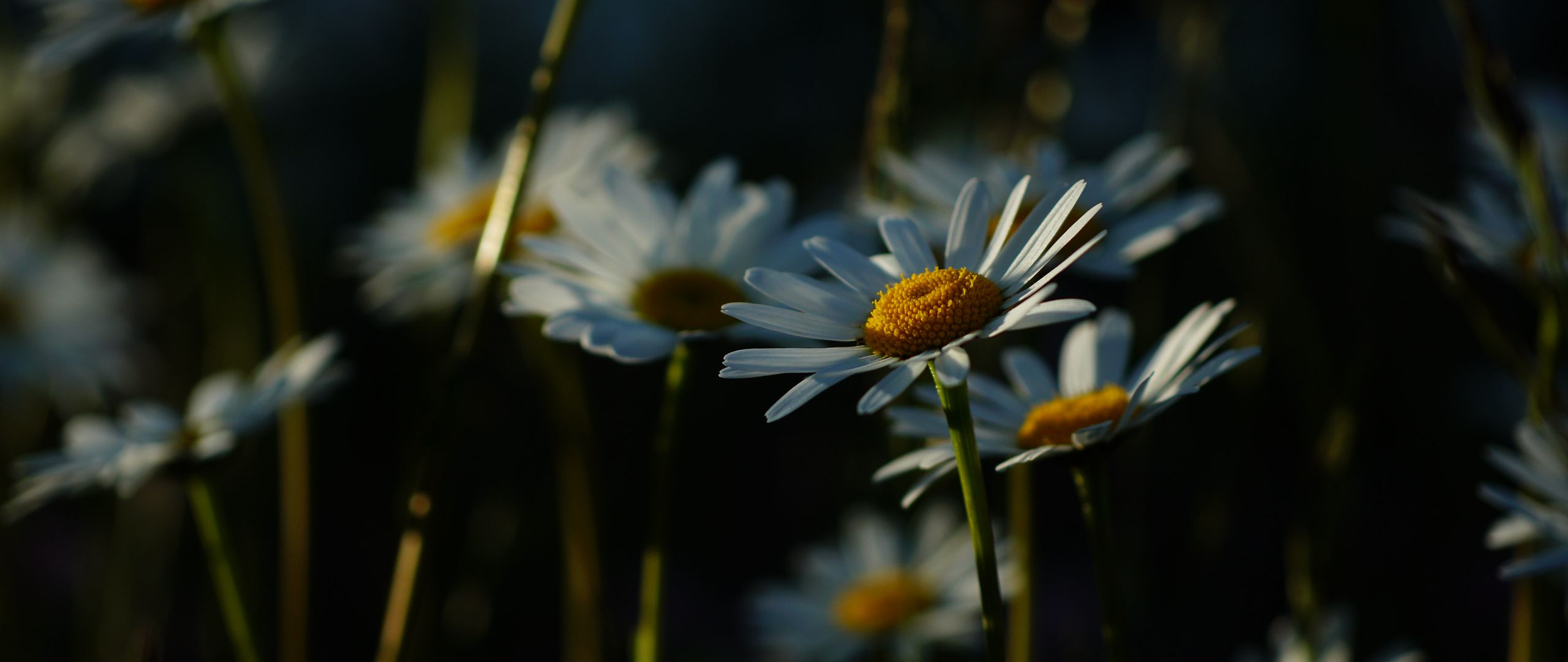 Download 2560x1080 daisies, plants, flowers, petals, dark wallpaper, background dual wide 1080p