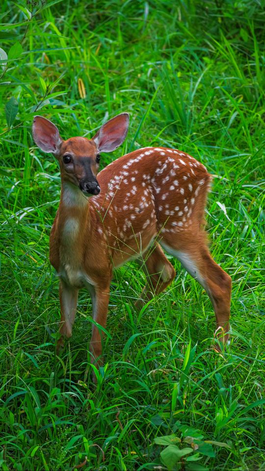 Download 540x960 deer, cute, grass, leaves, animal, green wallpaper, background samsung galaxy s4 mini, microsoft lumia 535, philips xenium, lg l90, htc sensation