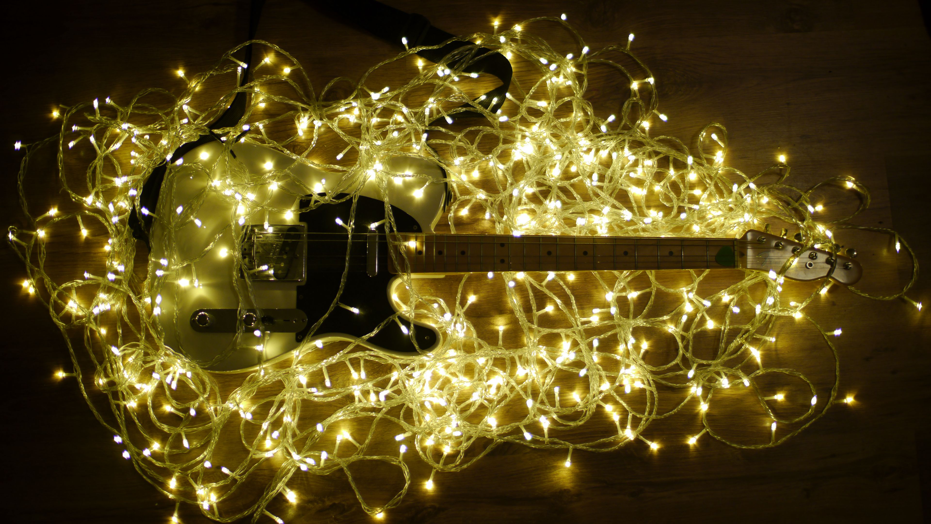 Download 3840x2160 electric guitar, guitar, music, garland, glow wallpaper, background 4k uhd 16:9