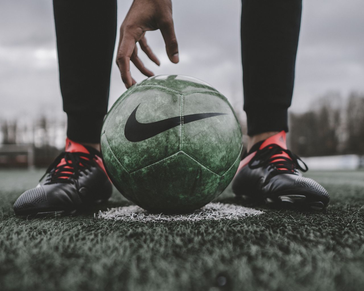 Download 1280x1024 footballball, ball, football, football player, lawn wallpaper, background standard 5:4
