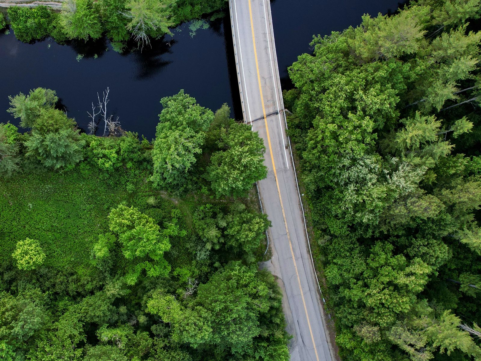 Download 1600x1200 forest, trees, road, aerial view wallpaper, background standard 4:3