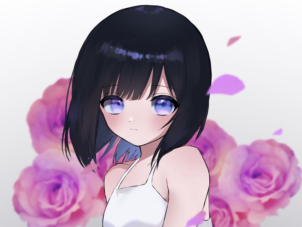 Download 1152x864 girl, dress, flowers, petals, glance, anime, art, cartoon wallpaper, background standard 4:3