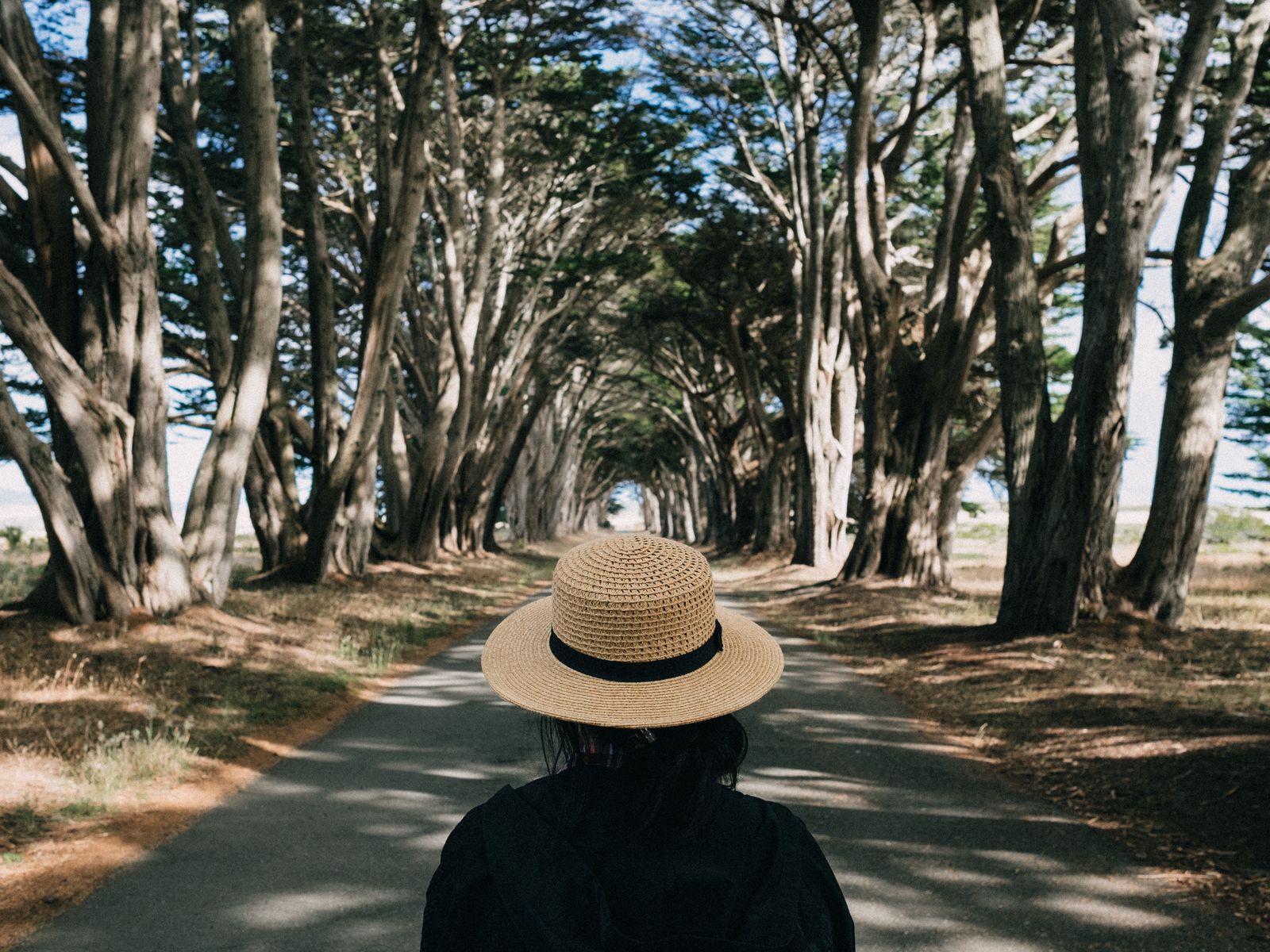 Download 1600x1200 girl, hat, road, trees, aesthetics wallpaper, background standard 4:3