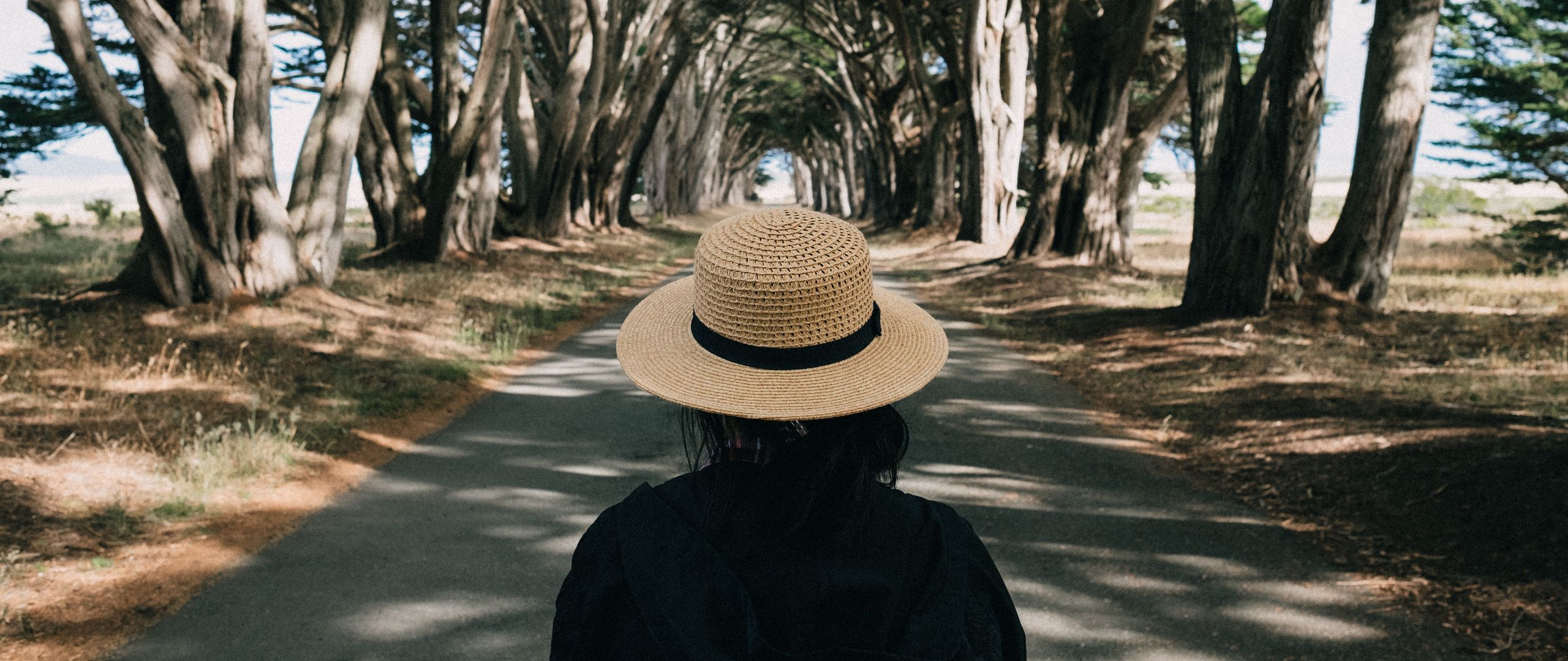 Download 2560x1080 girl, hat, road, trees, aesthetics wallpaper, background dual wide 1080p
