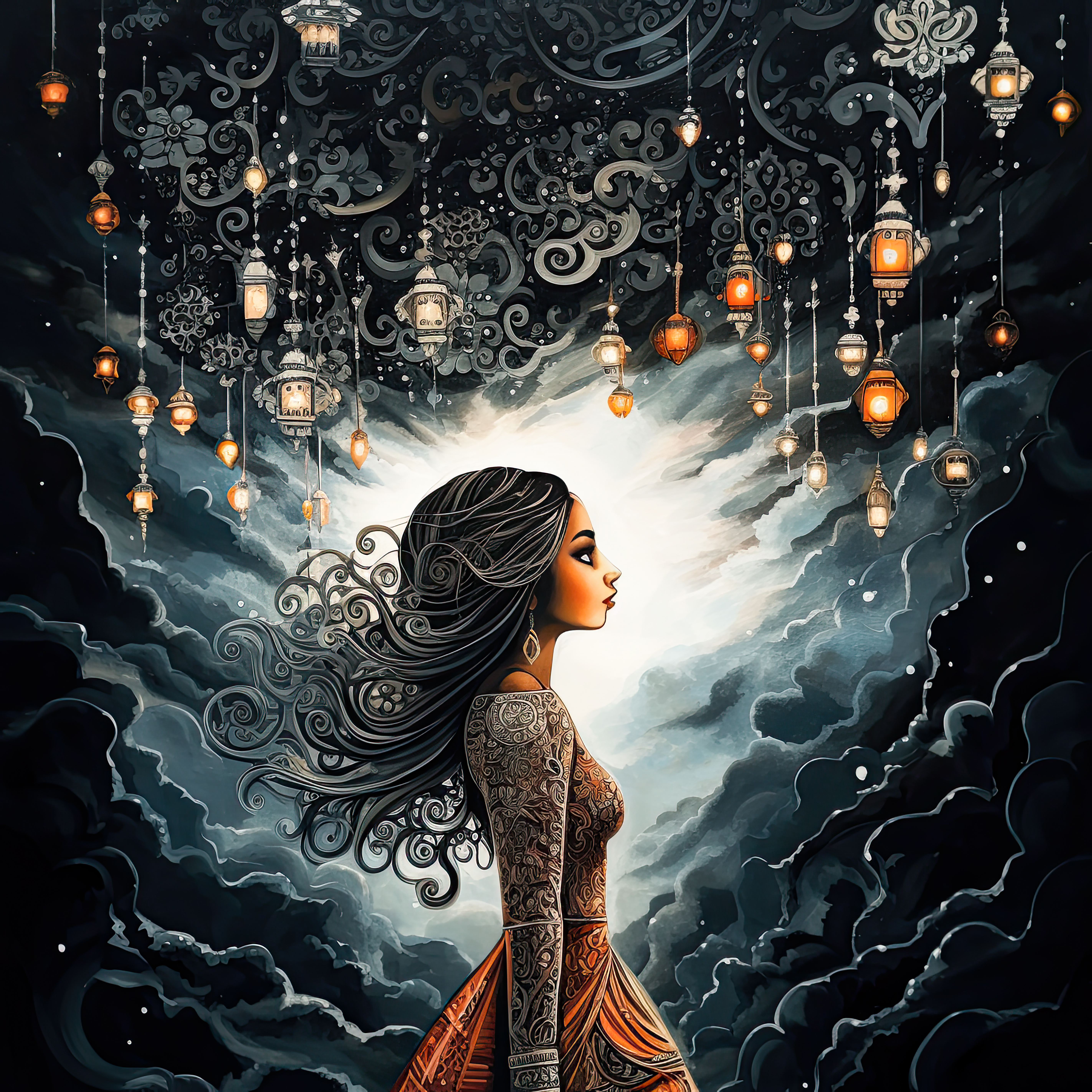 Download 5689x5689 girl, jewelry, lamps, clouds, waves, art wallpaper, background