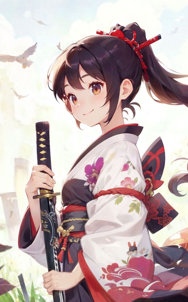 Download 800x1280 girl, katana, kimono, smile, anime, art wallpaper, background samsung galaxy note gt-n7000, meizu mx2