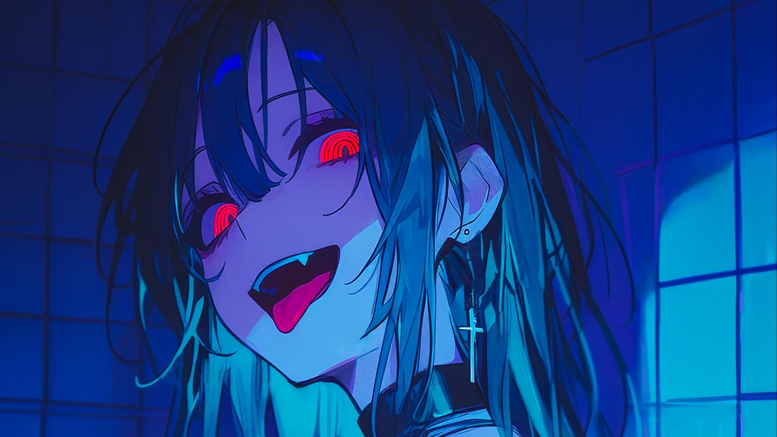 Download 1600x900 girl, vampire, bathroom, fangs, art, anime, blue wallpaper, background widescreen 16:9