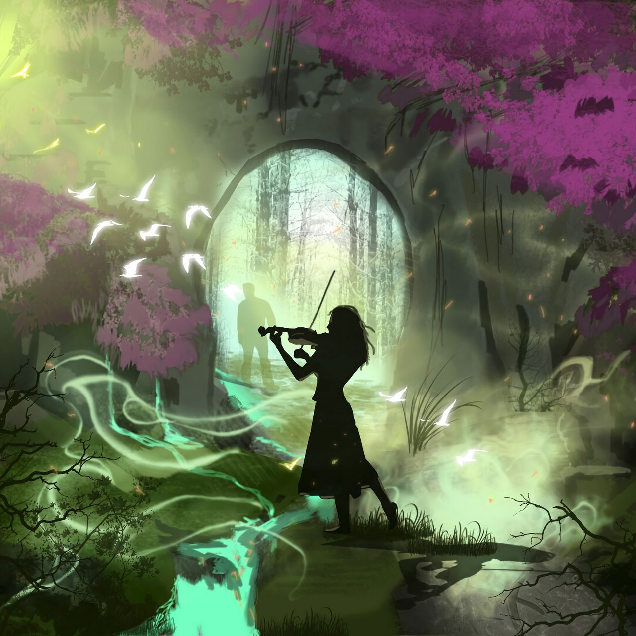 Download 1280x1280 girl, violin, silhouettes, garden, art wallpaper, background ipad, ipad 2, ipad mini for parallax