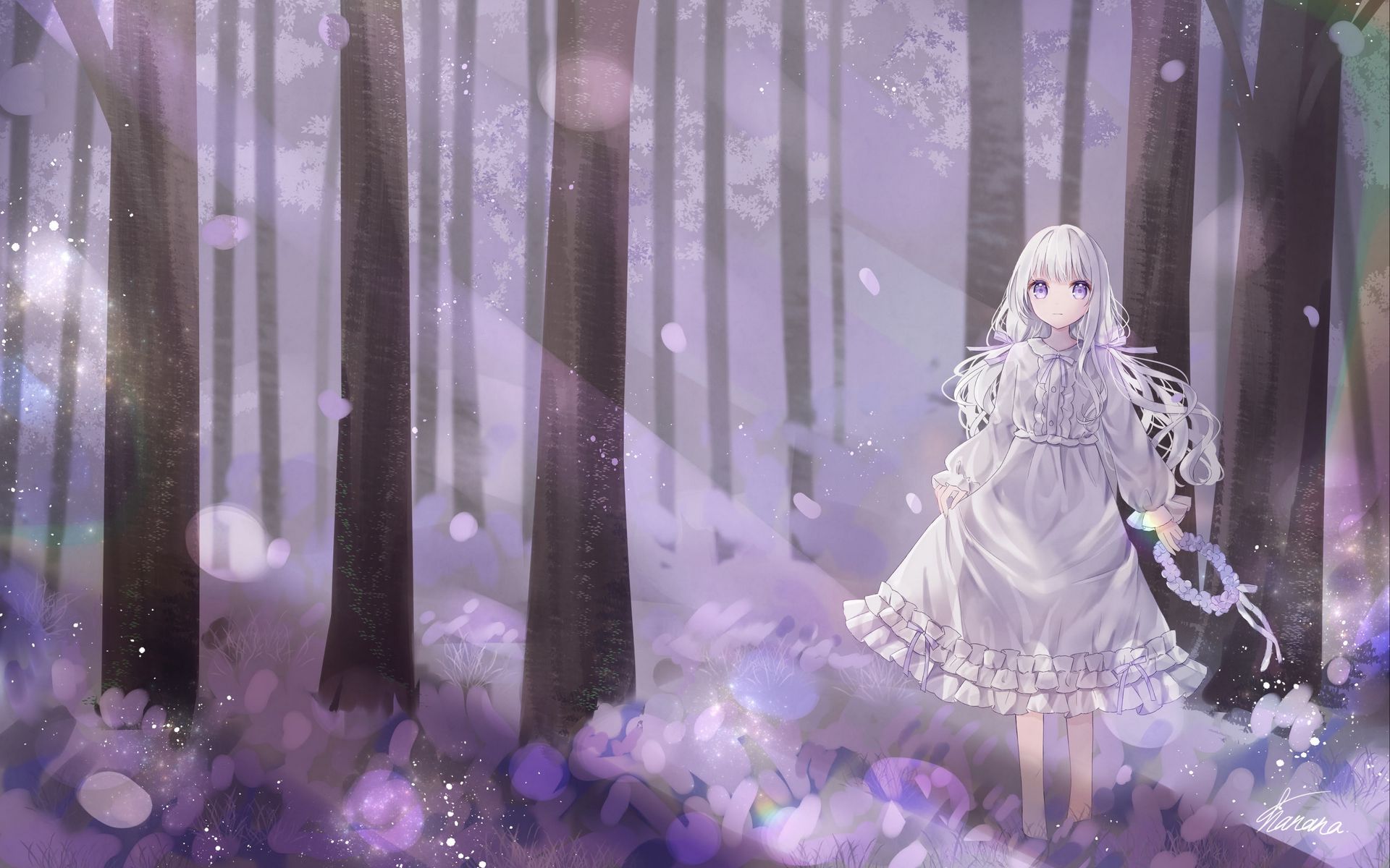 Download 1920x1200 girl, wreath, dress, forest, anime, art, purple wallpaper, background widescreen 16:10