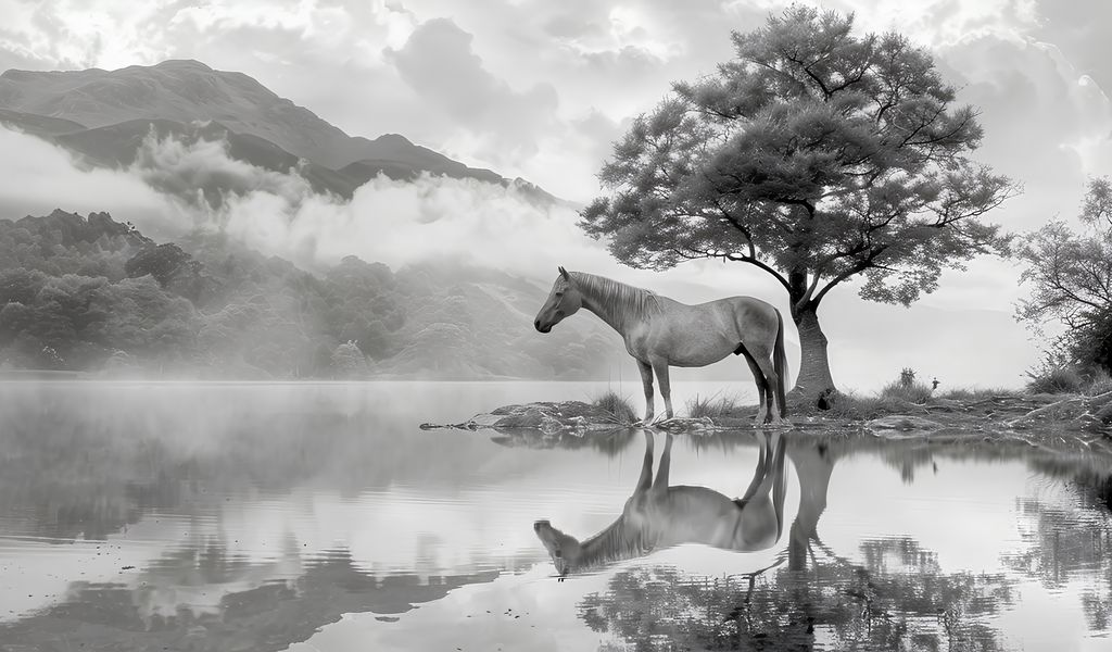 Download 1024x600 horse, tree, reflection, pond, bw wallpaper, background netbook, tablet