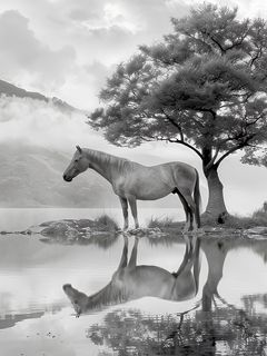 Download 240x320 horse, tree, reflection, pond, bw wallpaper, background old mobile, cell phone, smartphone