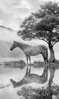 Download 240x400 horse, tree, reflection, pond, bw wallpaper, background nokia asha 311, samsung galaxy 580, omnia, lg kp500