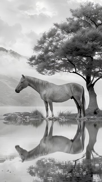 Download 360x640 horse, tree, reflection, pond, bw wallpaper, background nokia n8, c5, c6, c7, e7, x6 nokia 5800, 5230, 5228, sony ericsson vivaz