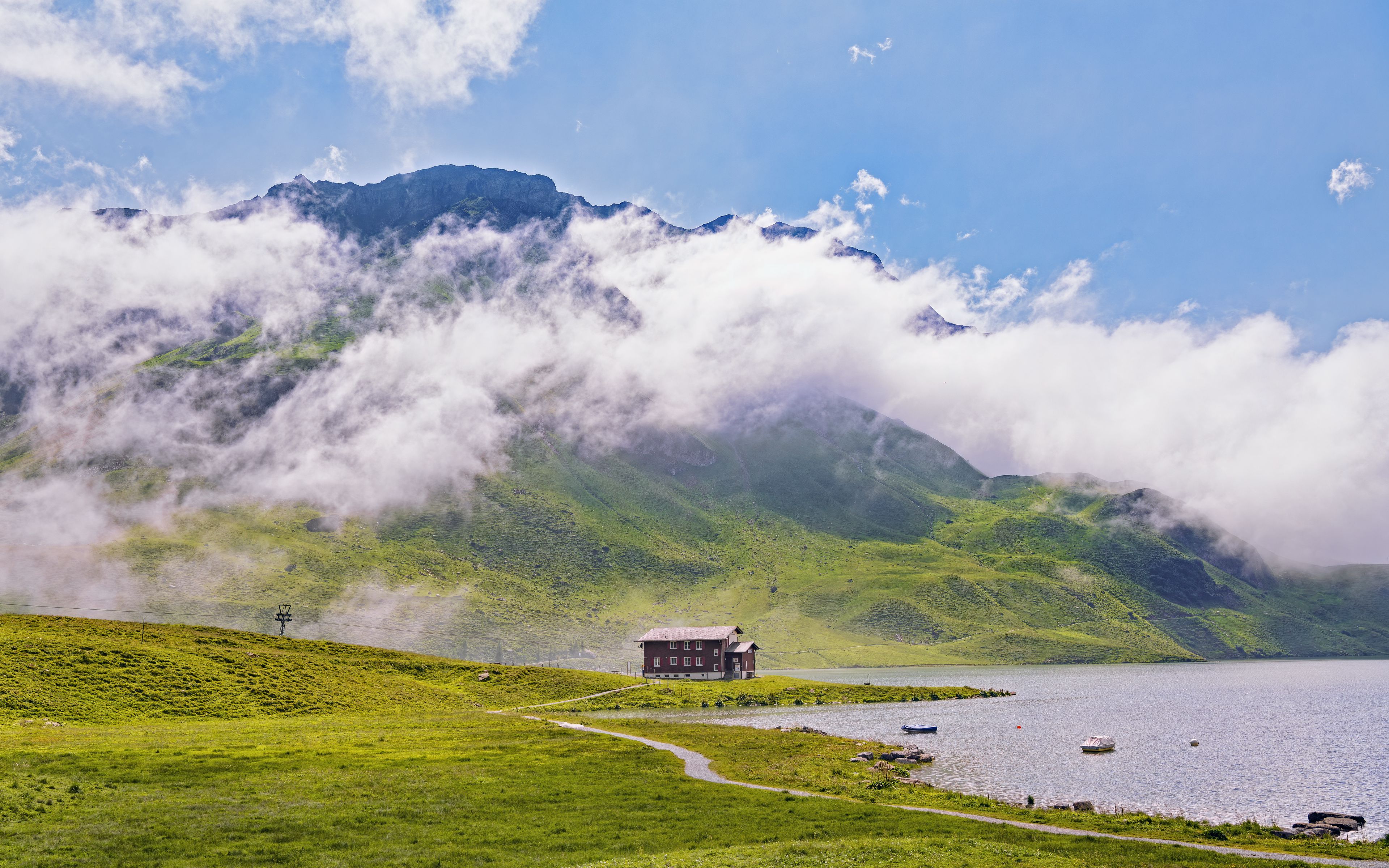 Download 3840x2400 house, coast, mountains, clouds, nature wallpaper, background 4k ultra hd 16:10