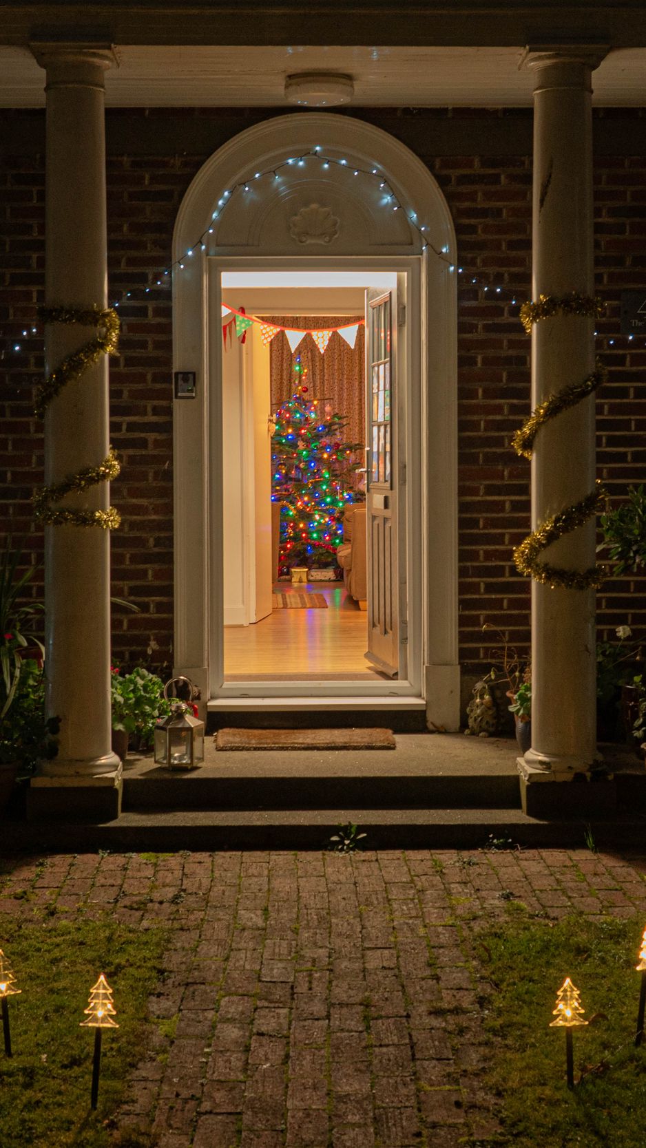 Download 938x1668 house, garlands, columns, christmas tree, new year, christmas wallpaper, background iphone 8/7/6s/6 for parallax