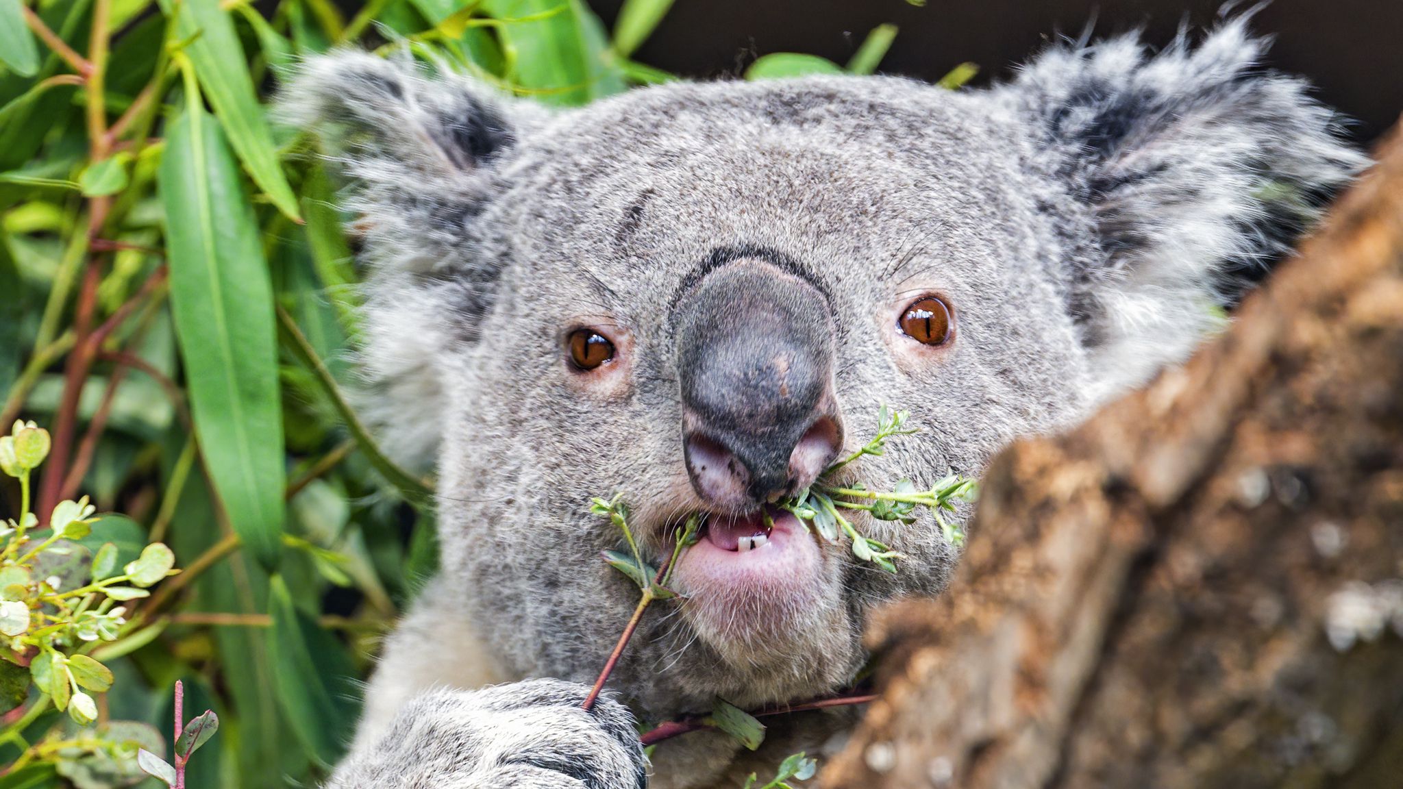 Download 2048x1152 koala, tree, wild animal, bark wallpaper, background ultrawide monitor