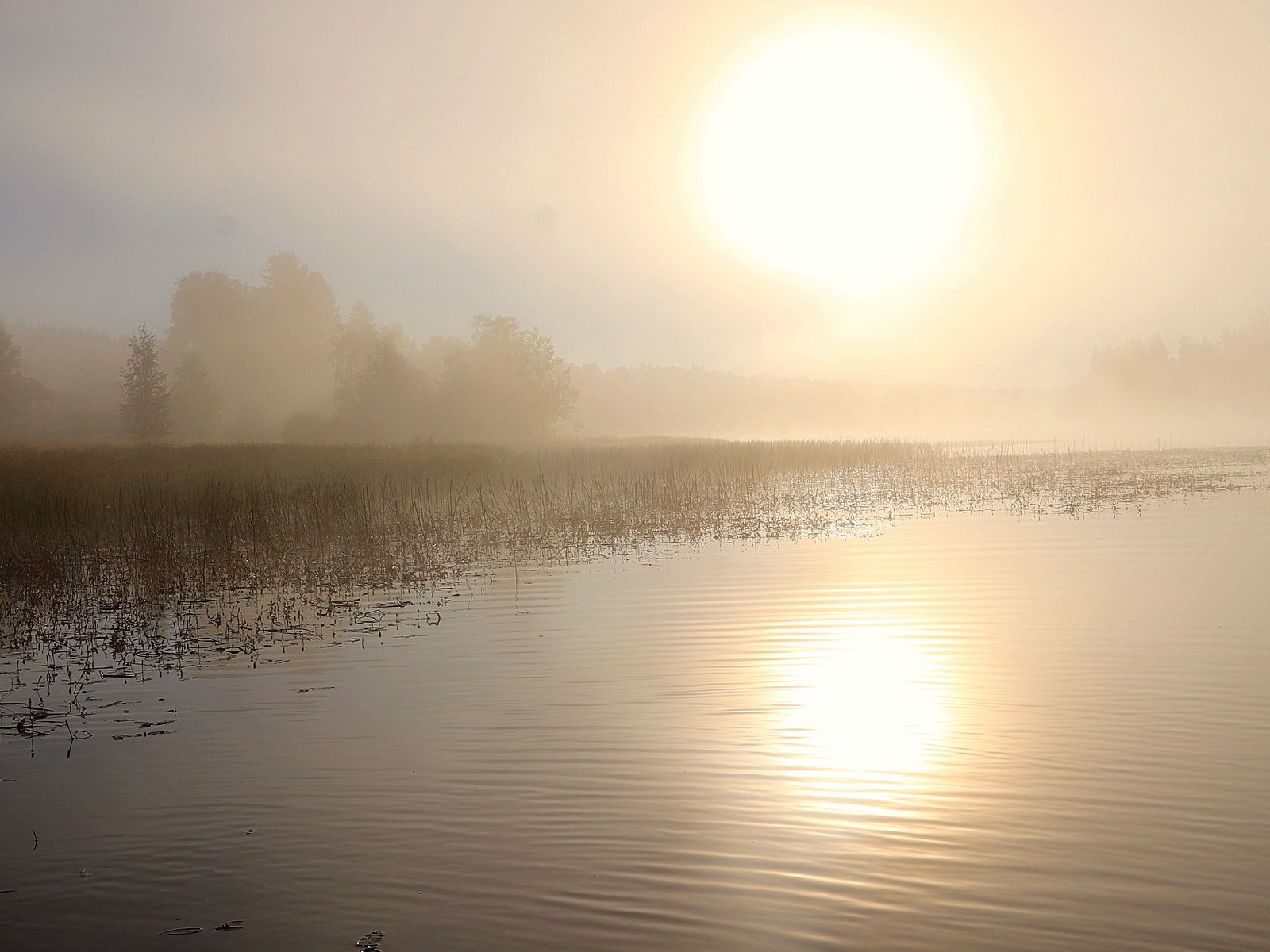 Download 1600x1200 lake, sun, fog, trees wallpaper, background standard 4:3