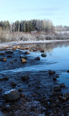 Download 240x400 lake, water, stones, snow, trees, winter, forest, nature wallpaper, background nokia asha 311, samsung galaxy 580, omnia, lg kp500