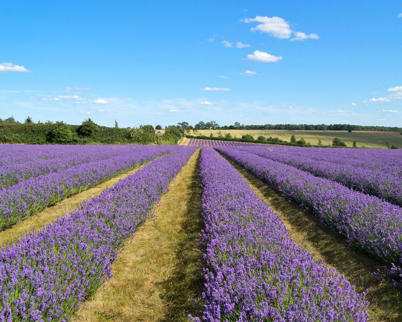 Download 1280x1024 lavender, field, flowers, bushes, clouds, landscape wallpaper, background standard 5:4