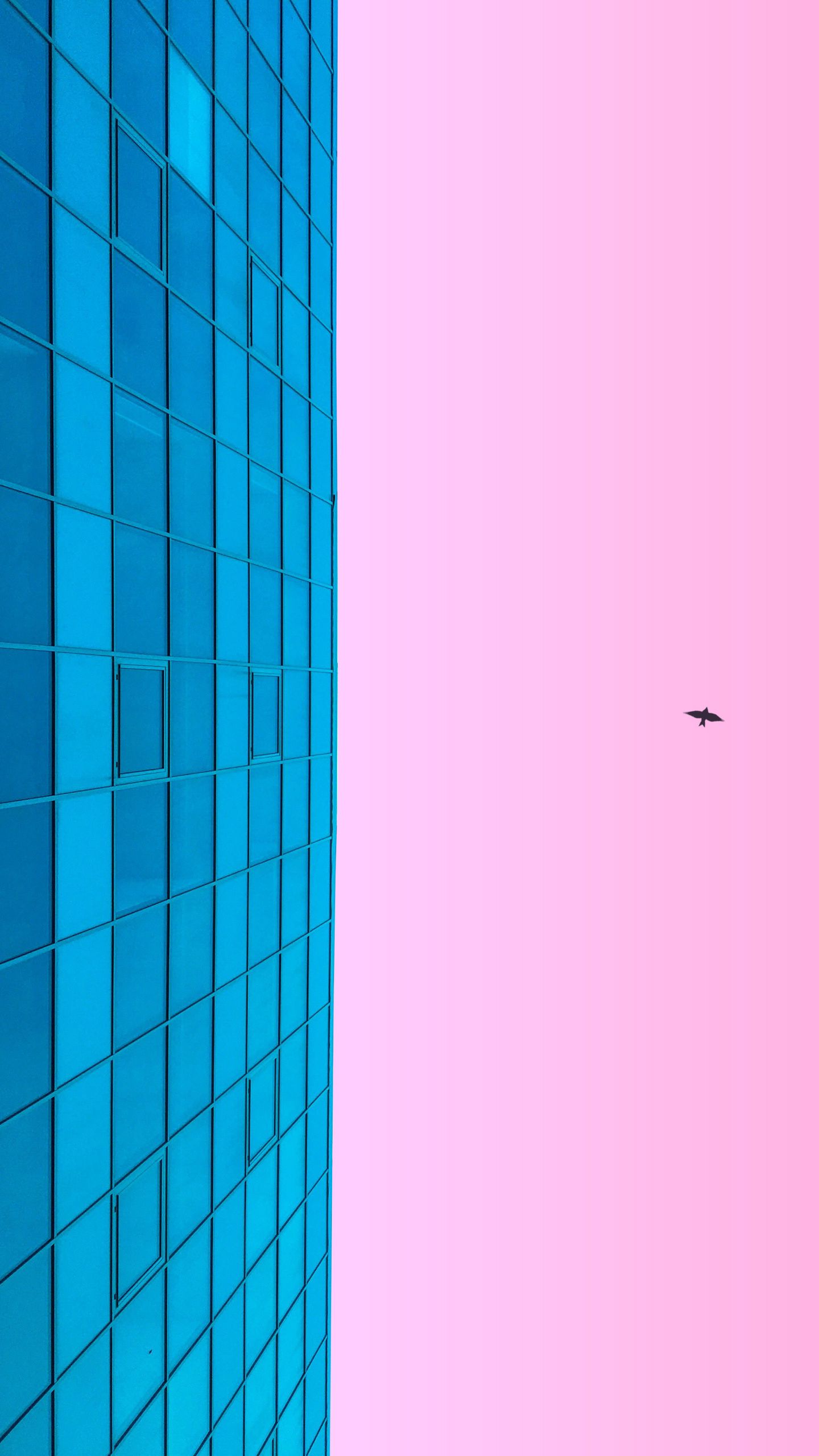 Download 1440x2560 minimalism, blue, pink, building, sky, bird wallpaper, background qhd samsung galaxy s6, s7, edge, note, lg g4