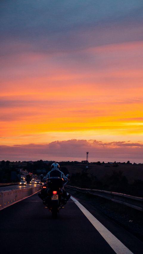 Download 480x854 motorcyclist, sunset, sky, clouds, road, marking wallpaper, background nokia lumia 630, sony ericsson xperia