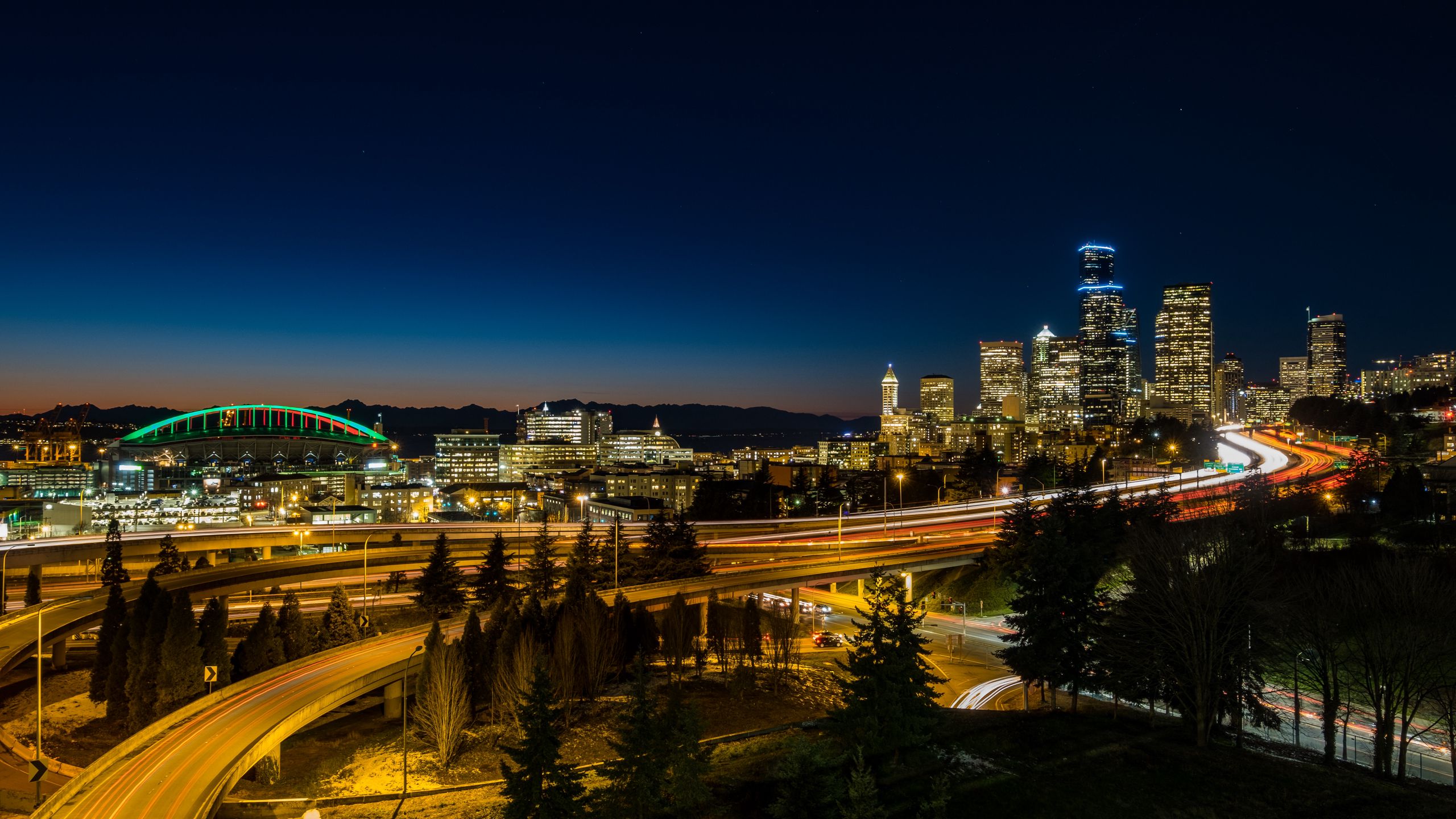 Download 2560x1440 night city, city lights, architecture, street, seattle, united states wallpaper, background widescreen 16:9