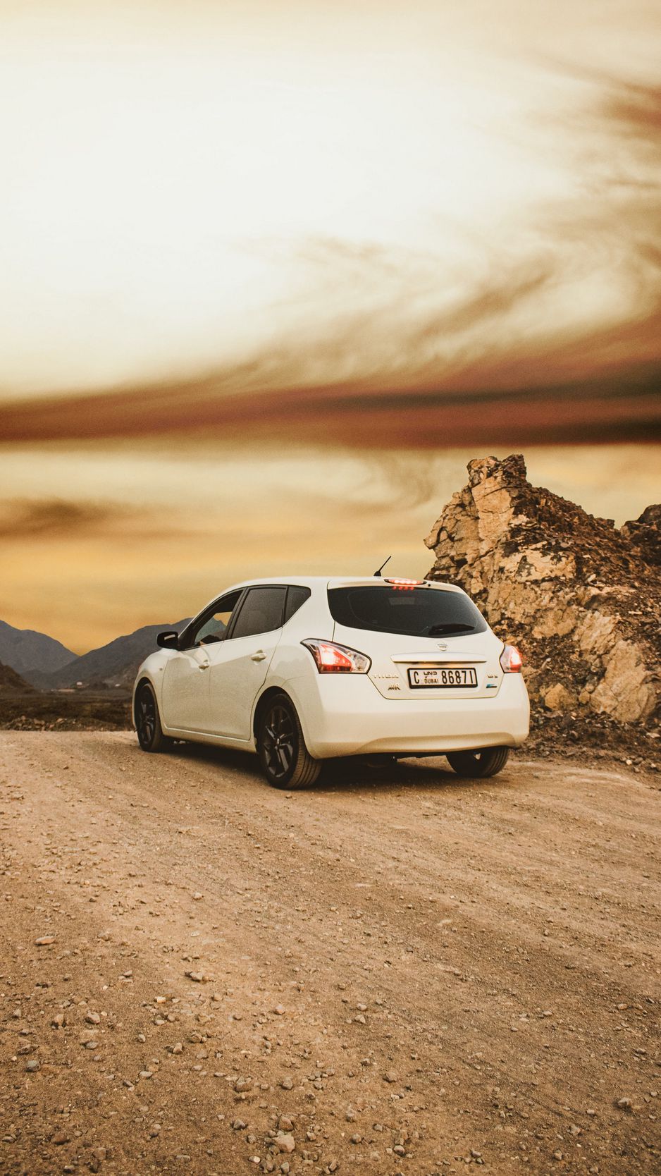 Download 938x1668 nissan tiida, nissan, car, rear view, rocks, road wallpaper, background iphone 8/7/6s/6 for parallax