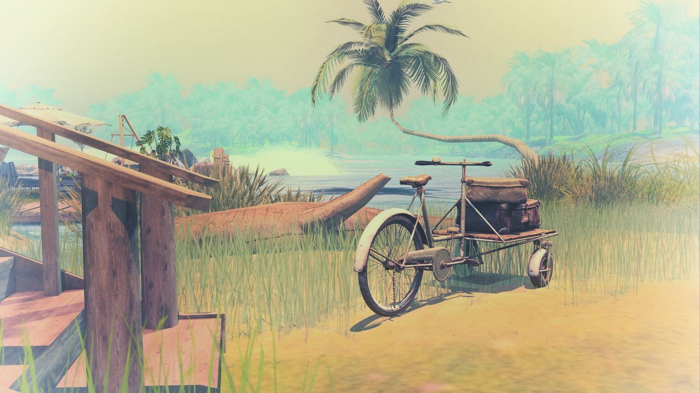 Download 1366x768 palm tree, art, lagoon, beach, bicycle, grass, wheel wallpaper, background tablet, laptop