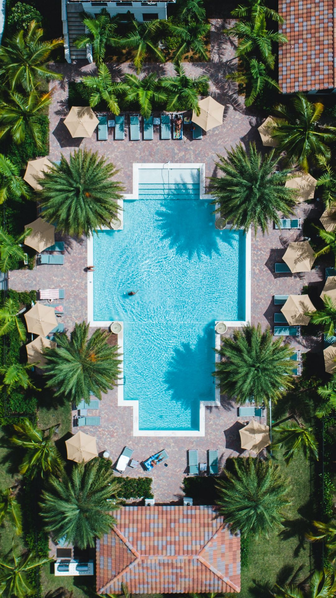 Download 1080x1920 pool, palm trees, aerial view wallpaper, background samsung galaxy s4, s5, note, sony xperia z, z1, z2, z3, htc one, lenovo vibe