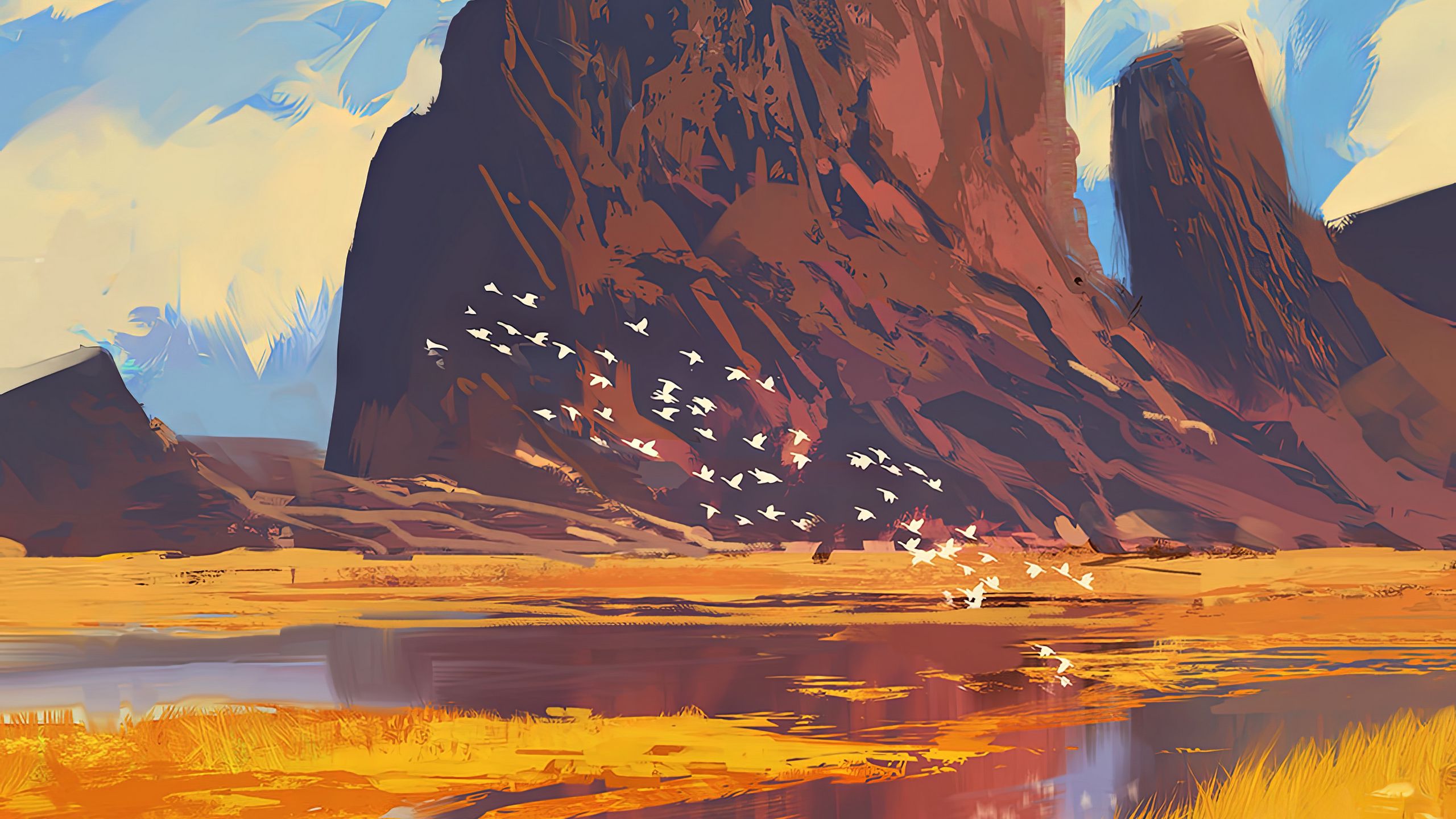 Download 2560x1440 rock, river, bird, art, shore wallpaper, background widescreen 16:9