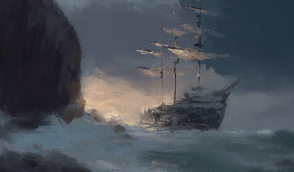 Download 1024x600 ship, stones, sea, waves, clouds, brush strokes, art wallpaper, background netbook, tablet