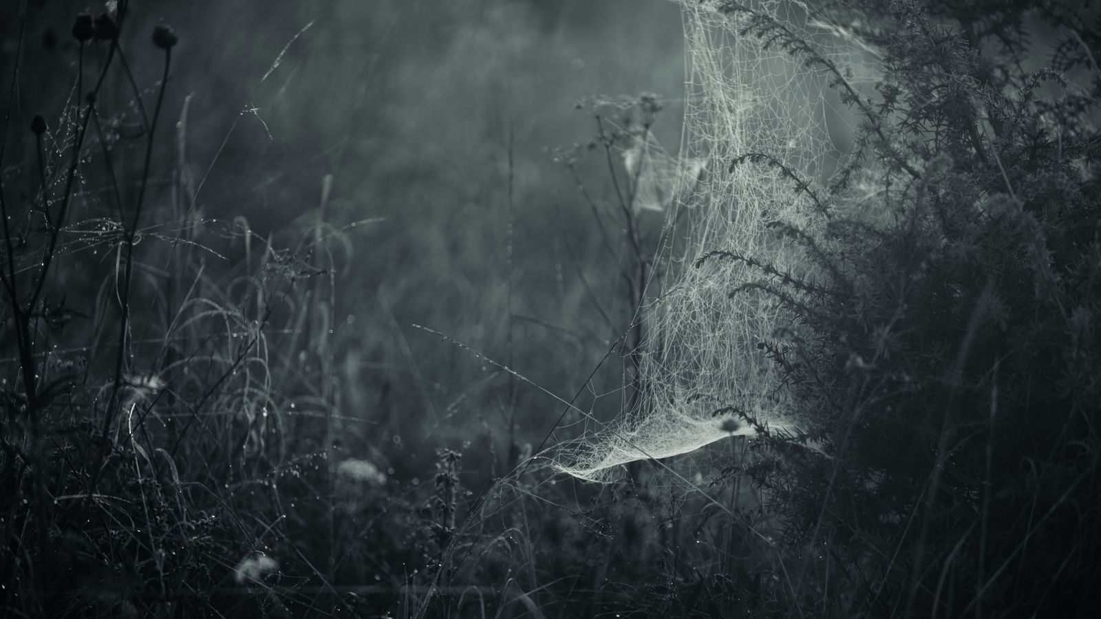 Download 1600x900 spiderweb, fog, bw, weaving, grass wallpaper, background widescreen 16:9
