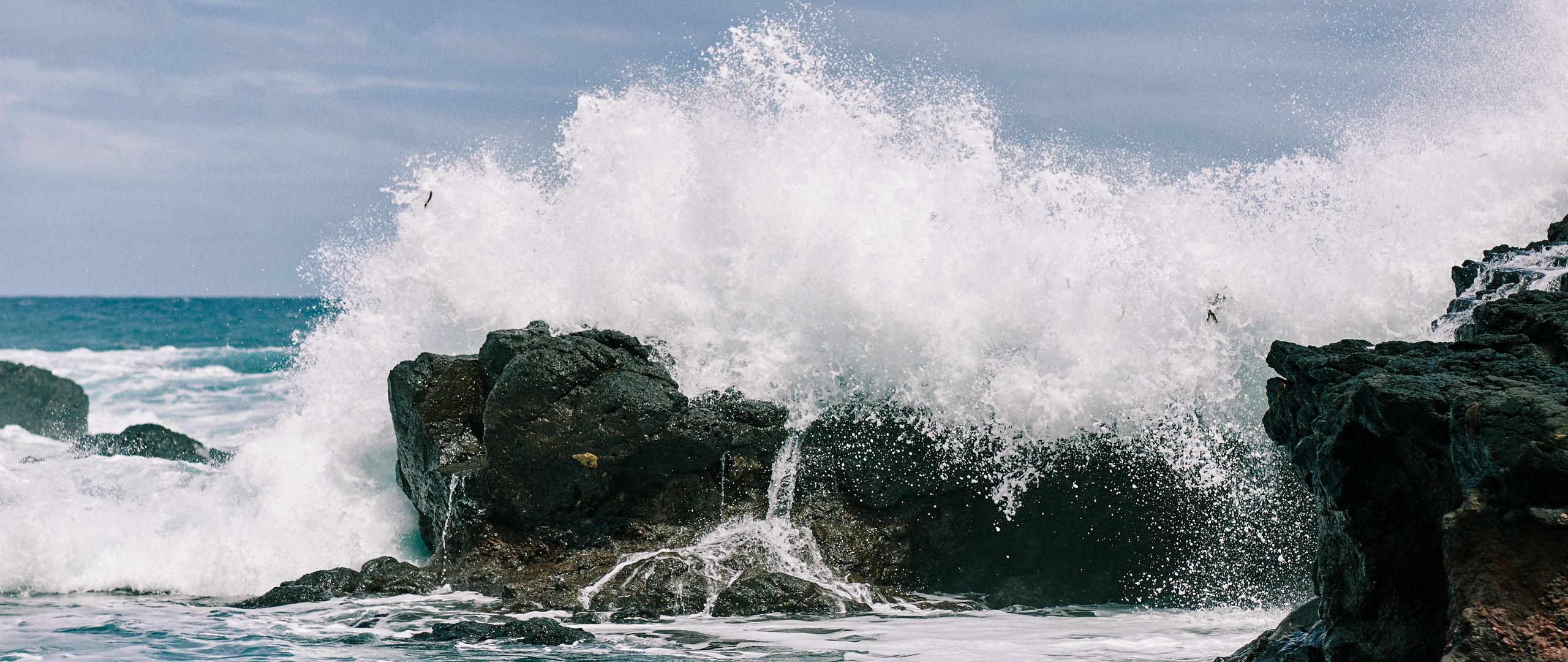 Download 2560x1080 spray, waves, shore, rocks wallpaper, background dual wide 1080p