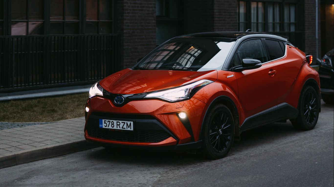 Download 1366x768 toyota, car, orange, building wallpaper, background tablet, laptop
