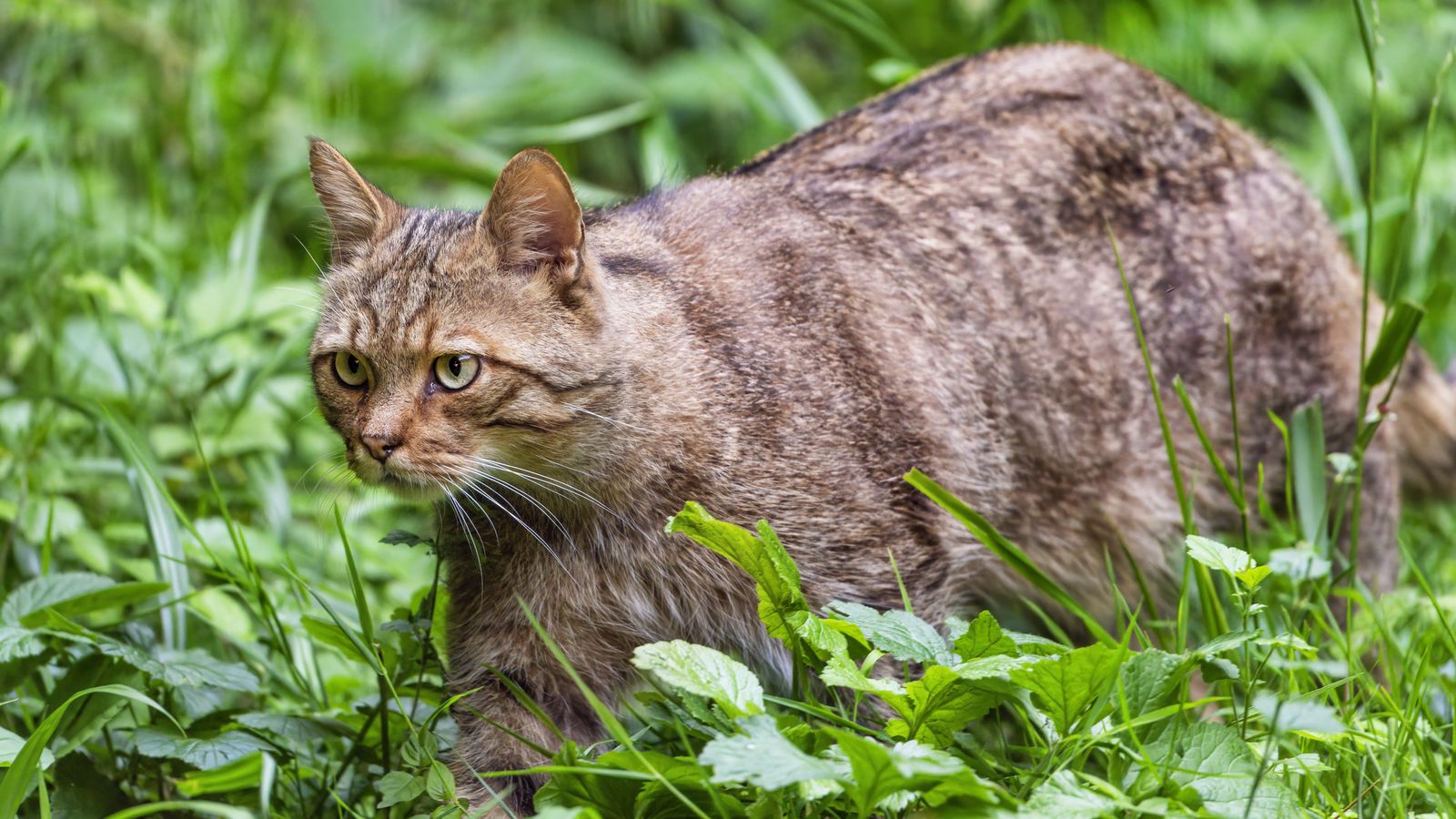 Download 1600x900 wildcat, grass, animal, wildlife, greenery wallpaper, background widescreen 16:9